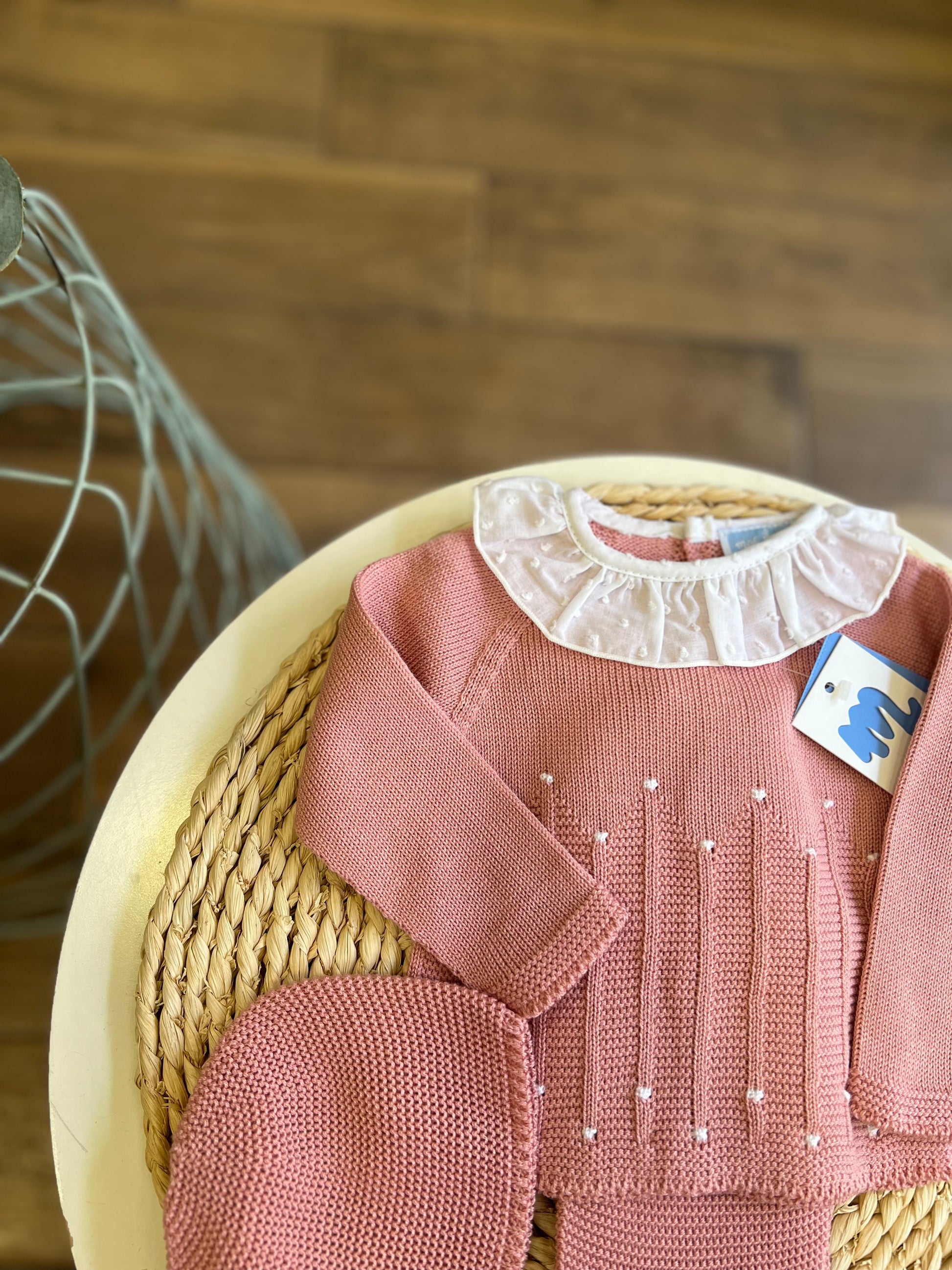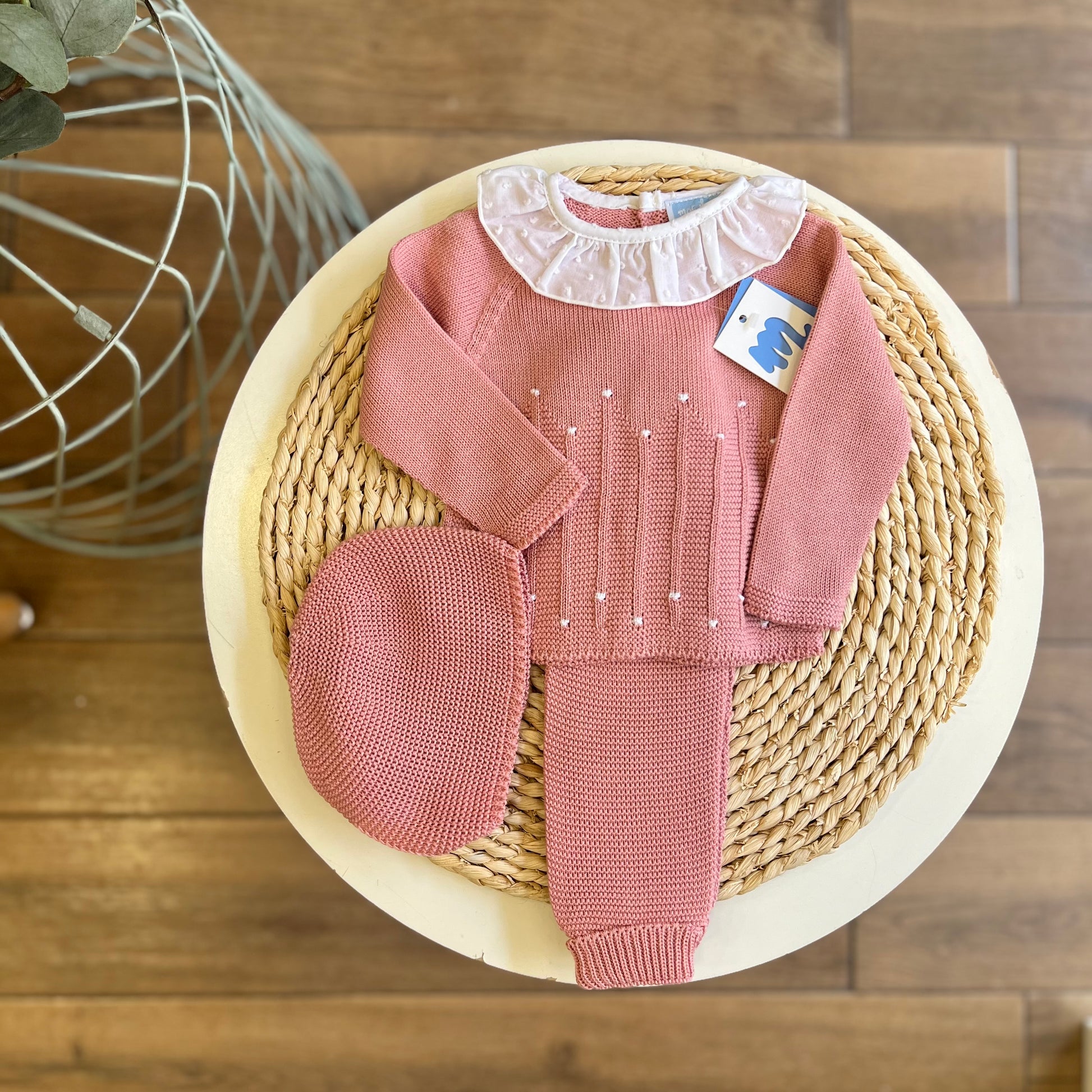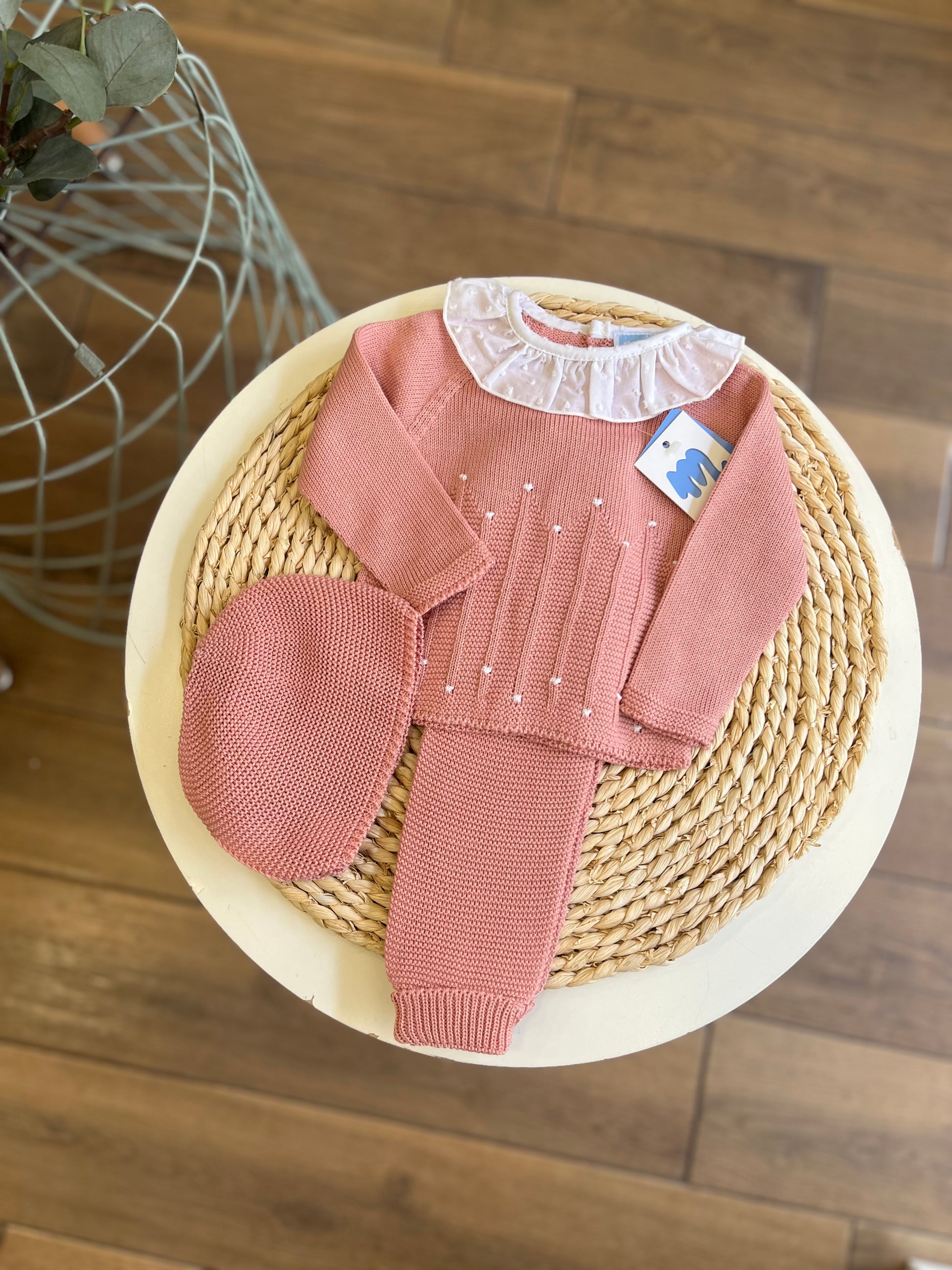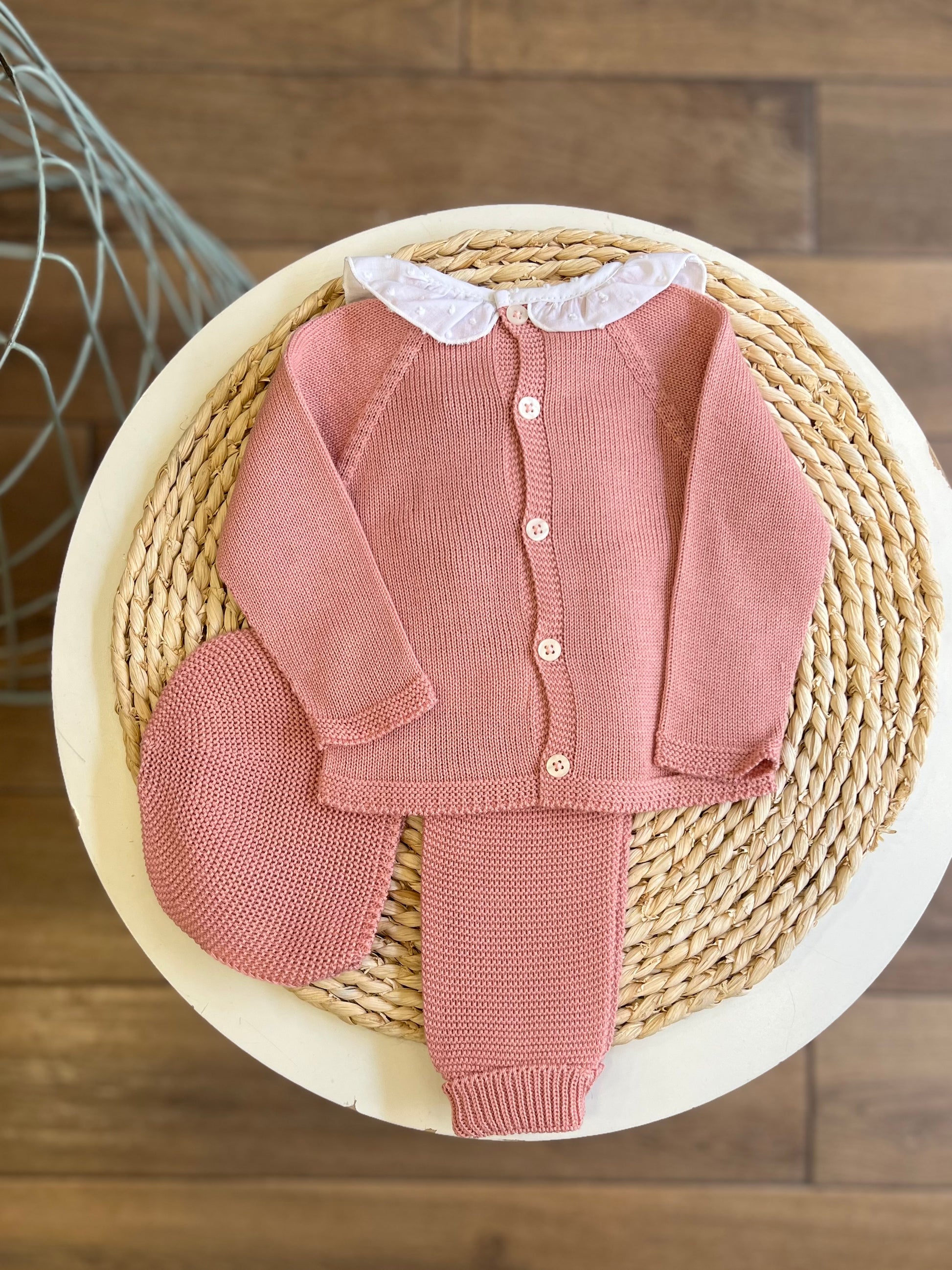 Set composto da maglia con colletto, pantalone e cuffia. Comoda chiusura sul retro con bottoncini in madreperla.