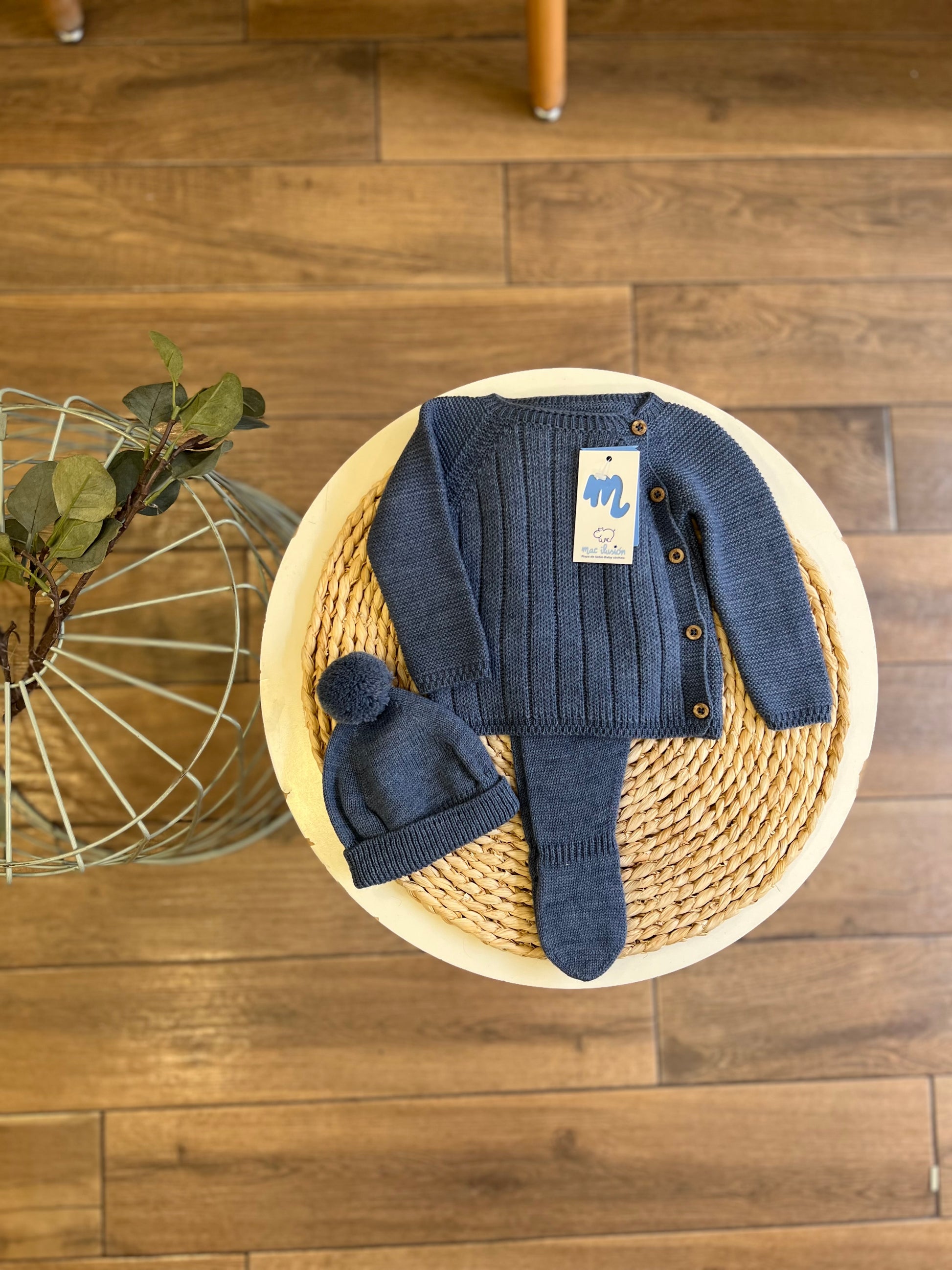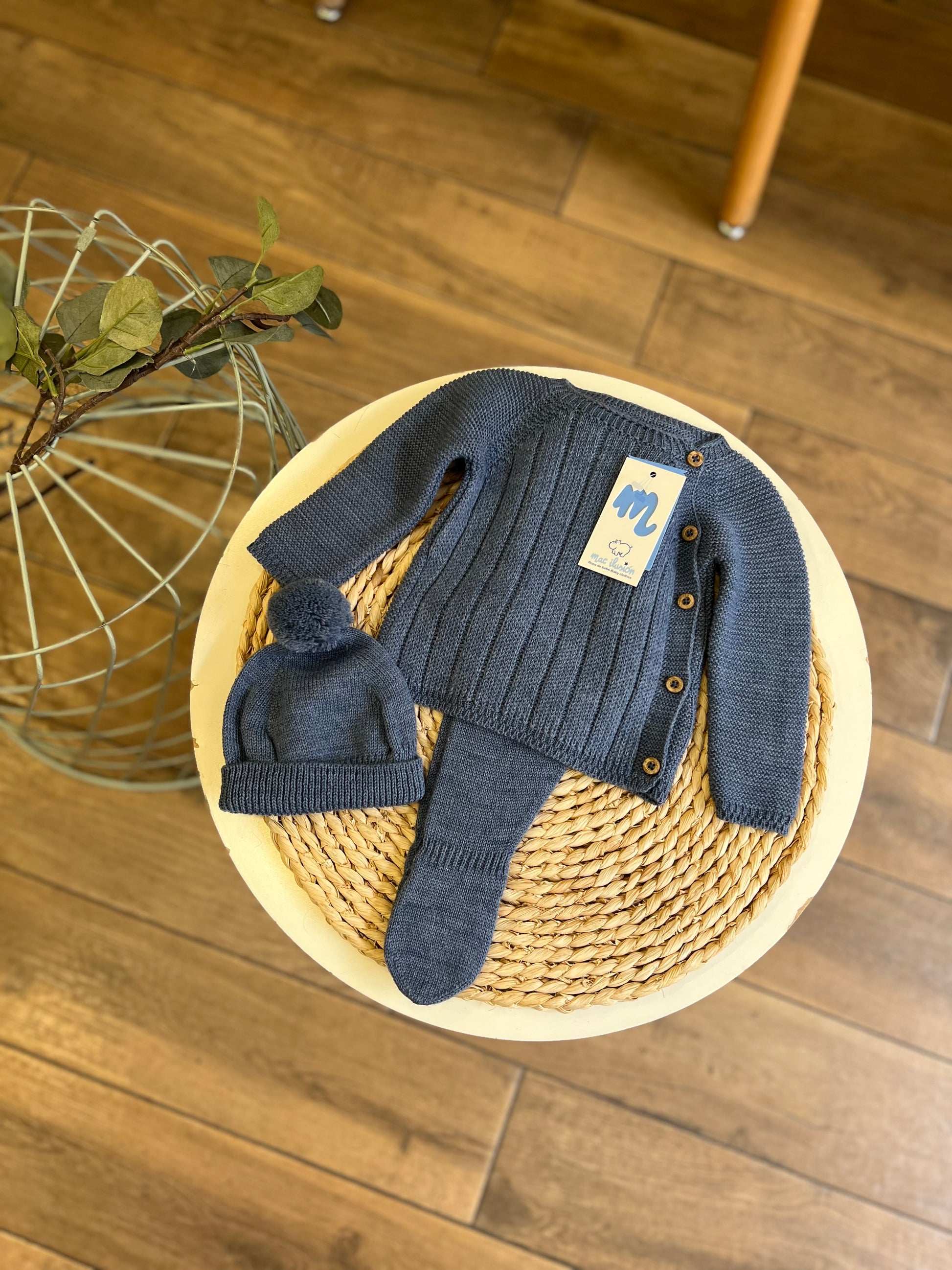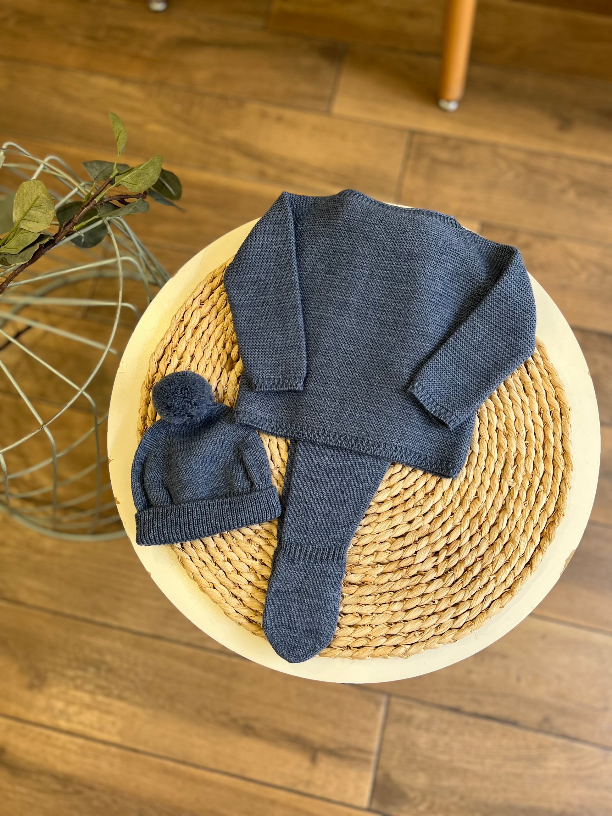 Set composto da maglia, ghettina e cappellino con pon pon. Comoda chiusura sul retro con bottoncini in madreperla.