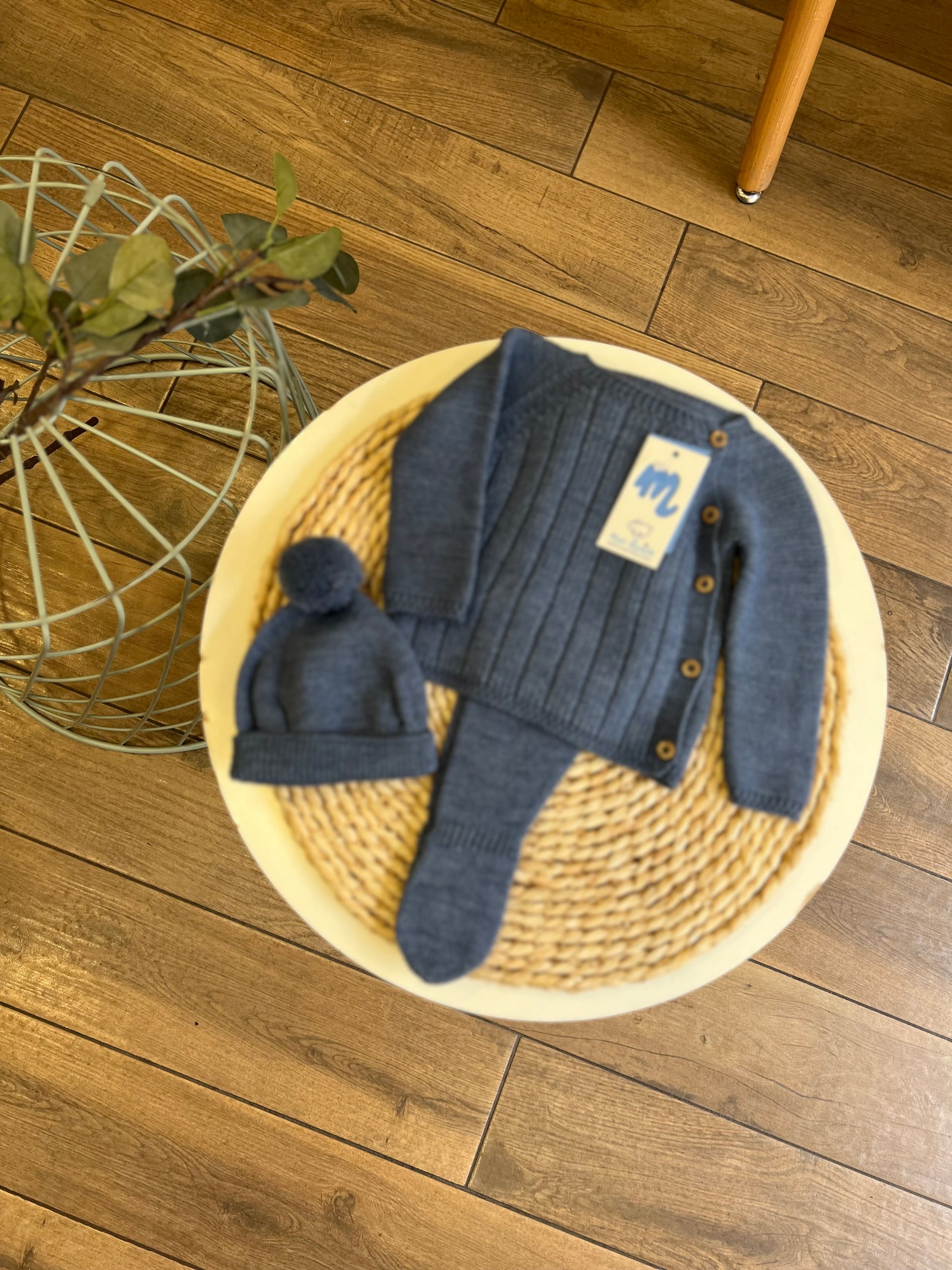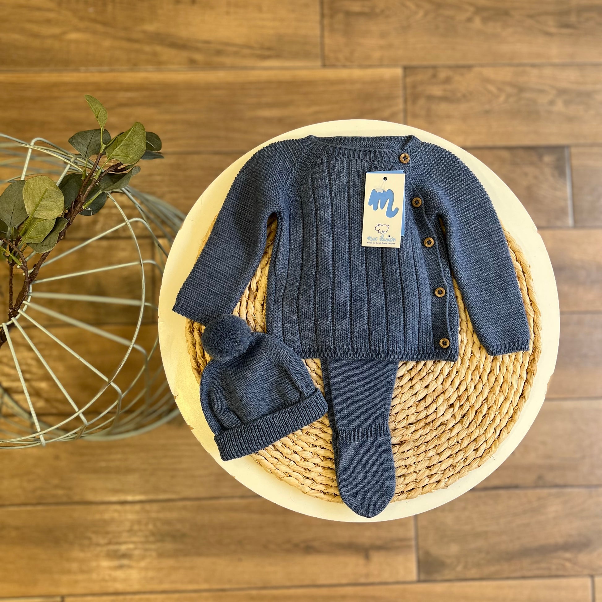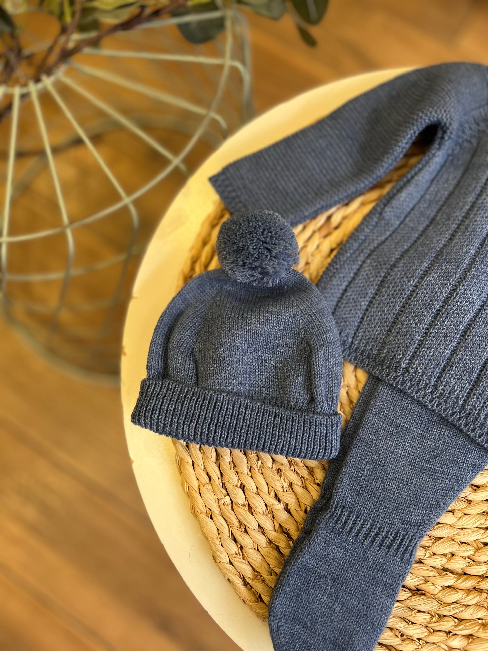 Set composto da maglia, ghettina e cappellino con pon pon. Comoda chiusura sul retro con bottoncini in madreperla.