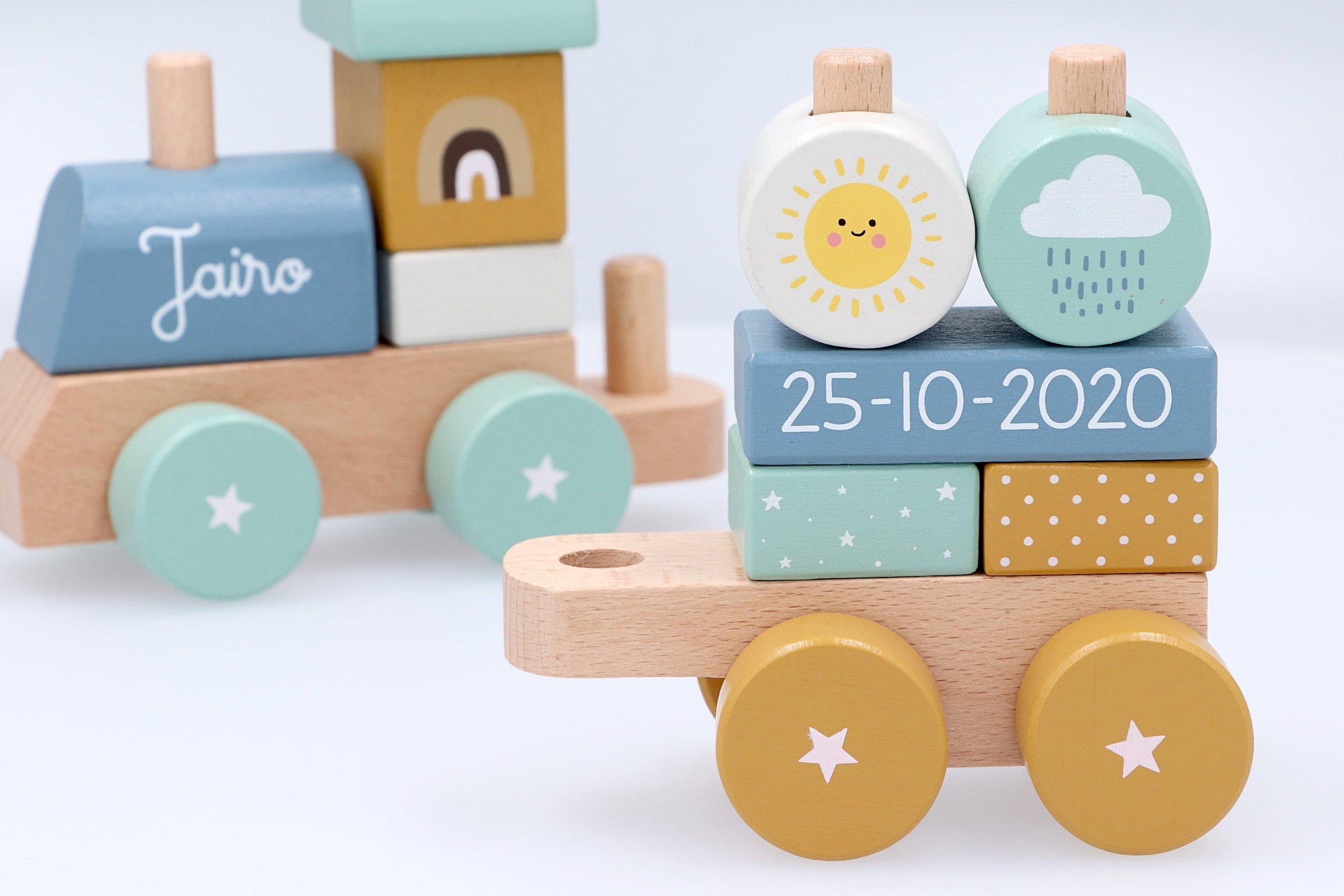 Trenino Zoo della collezione di giocattoli in legno di Monnëka in delicati toni pastello.